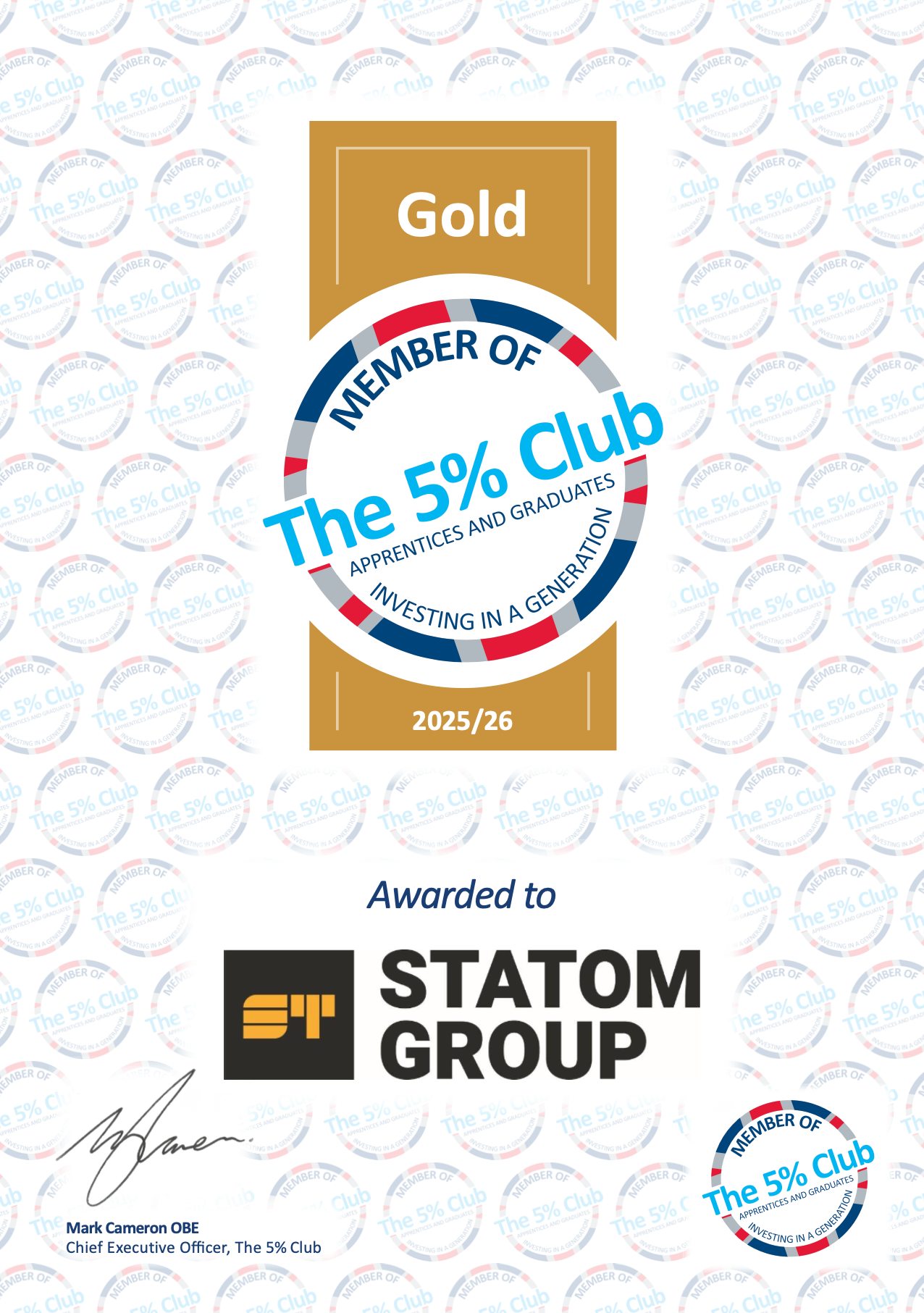Statom Group is proud to announce that it has officially achieved Gold Accredited Membership with The 5% Club, marking a significant milestone in the company’s commitment to developing people and investing in the future of the industry.